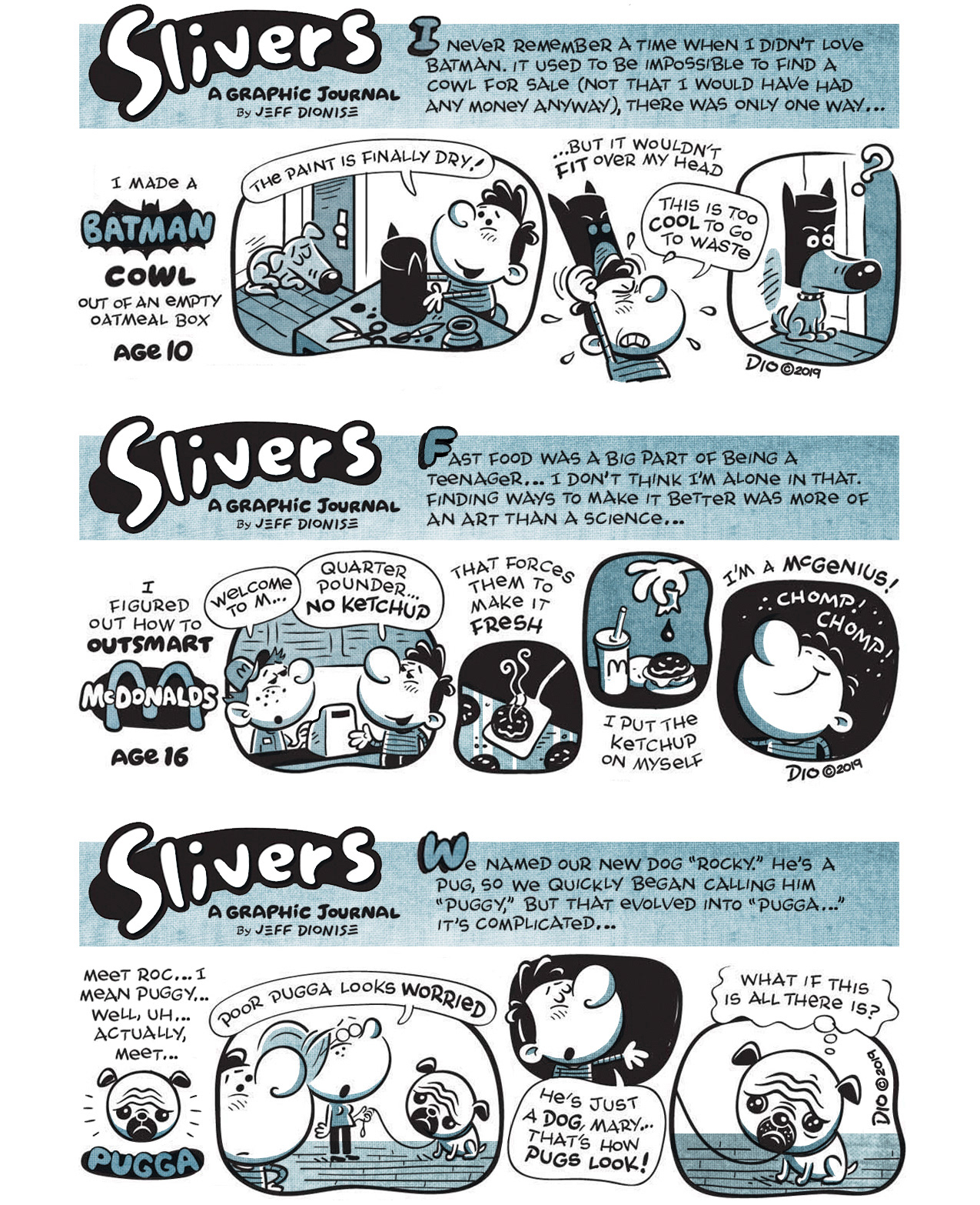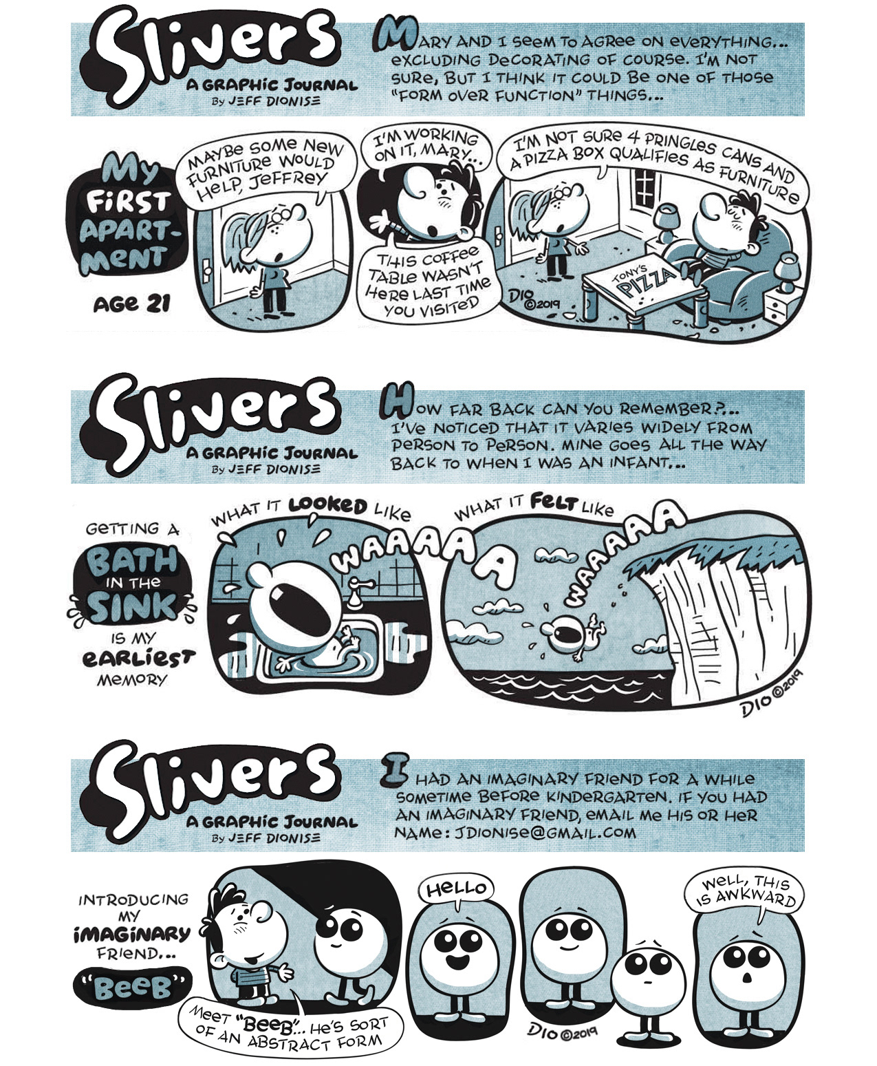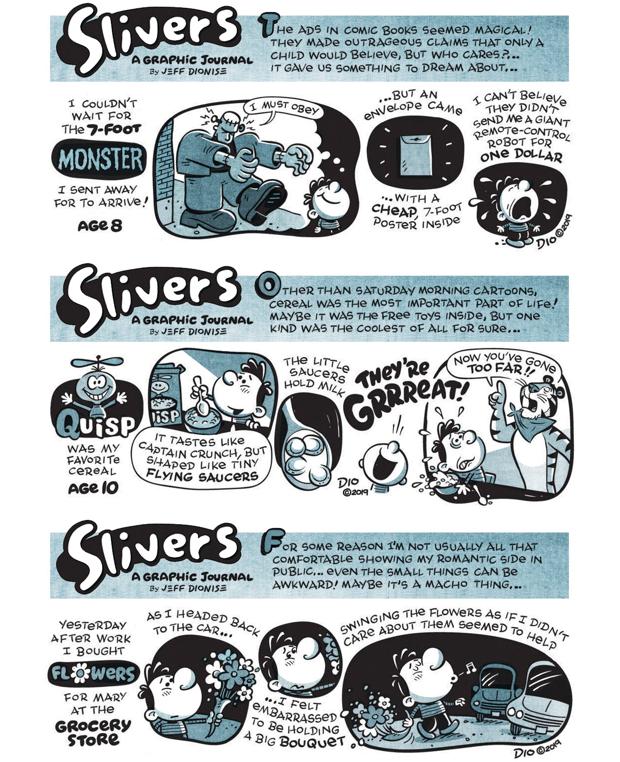 Slivers is a "graphic journal" comic strip. Each strip is a tiny sliver of life based on personal memories:
